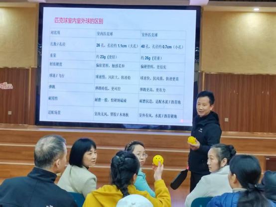 成立仪式后,王振华教授为大家带来PA视讯平台匹克球课程第一讲。王教授从匹克球的起源、基本规则入手,结合老年人身体特点,重点讲解了大陆式握拍、基础站姿、正手击球等入门技巧,并用 “握拍如握锤、挥拍似拂尘” 的通俗口诀帮助大家记忆。他还现场示范动作要领,手把手纠正老教师们的姿势,强调运动安全与循序渐进的重要性。老教师们热情高涨,认真听讲、积极练习,球拍击球的清脆声响与欢声笑语交织在一起,课堂氛围十分热烈。